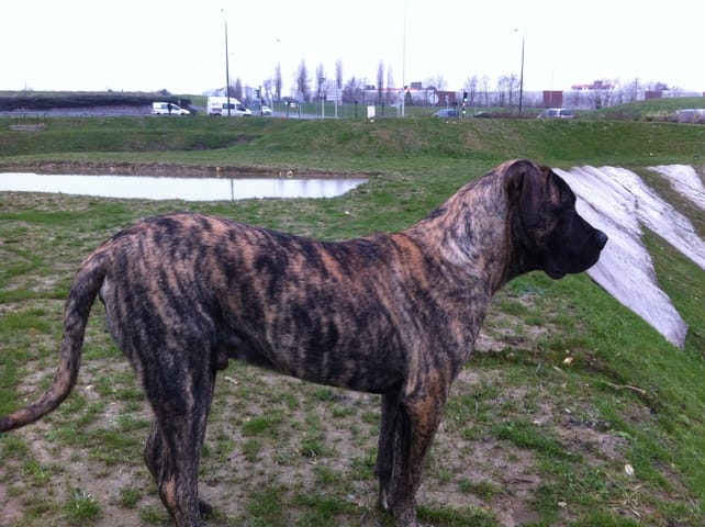 mon dogo a 7 mois 1/2, c'est un gros pantouflard, il faut que je lui apprenne la position assis statique car dès qu'il peut il se couche ..... j'essaie de mettre des photos mais le format est de trop grosse capacité