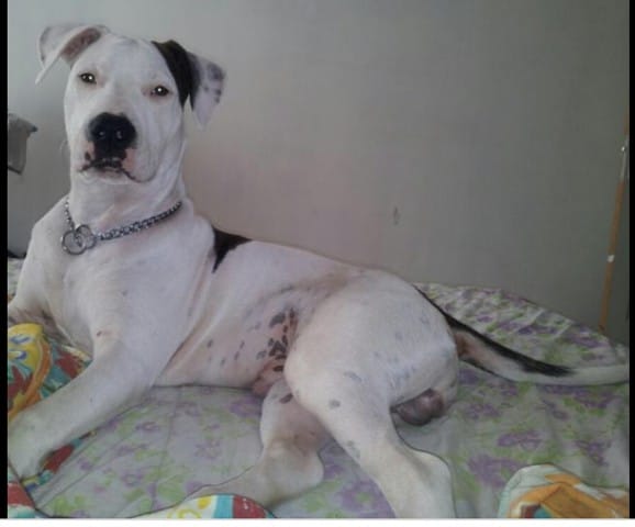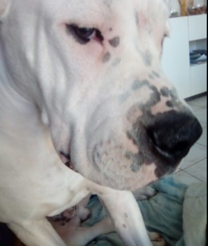 Voici des photos d’internet que j’ai pu trouver ( dogue argentin avec quelques taches noires “sur le Corp “ ):