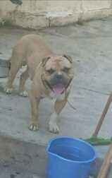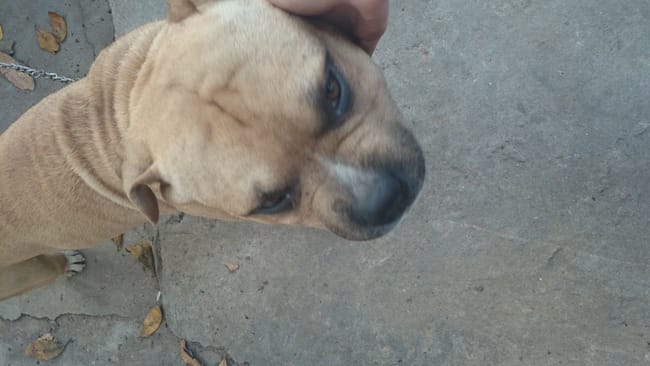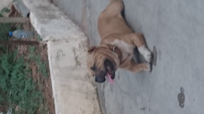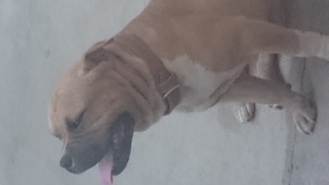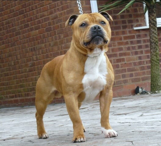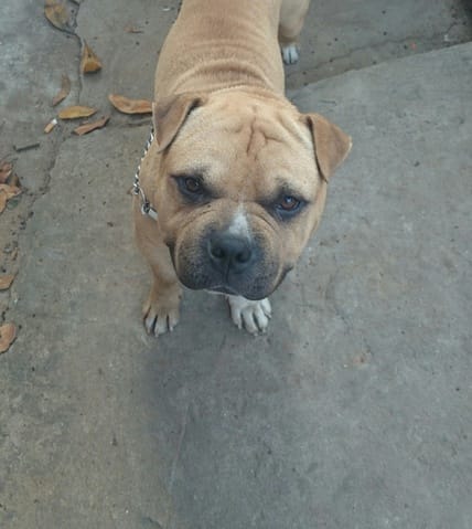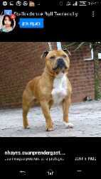 Il m'a dit que c'était un Staff américain, mais ayant fait des recherches je dirai plutôt que c'est un staffi, staffordshire bull terrier. Ou peut être un croisé?