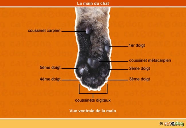 En gros il a les 4 doigts, chacun a son coussinet et sa griffe, et il a un pouce qui a une griffe qu'on appelle ergot et un coussinet qui ce petit "moignon" qui sort