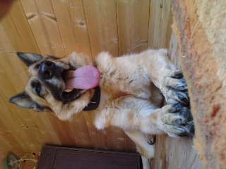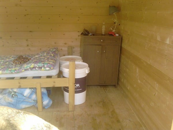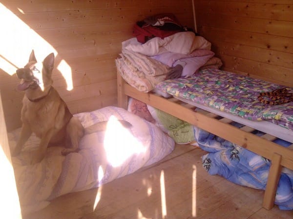- La cabane est maintenant bien terminé malgré qu'il y est beaucoup de couette ranger dedans (offert gentiment par le refuge pour le ''panier'' de bayka). Maintenant elle a un belle abri pour manger, faire dodo et au cas ou il pleuvrait!