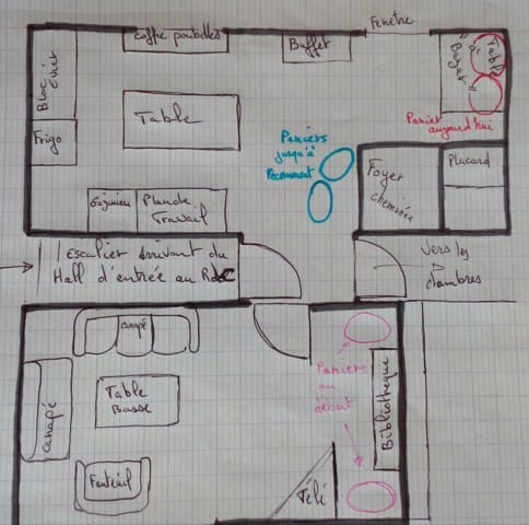 A l'origine leurs paniers se trouvaient dans le salon( en rose sur le dessin), le fait étant que l'on retrouvait souvent l'autre chien sur les canapés, celui-ci descend dès que l'on lui demande encore faut-il savoir qu'il y est grimpé. Mais étant donné qu'il aime particulièrement défoncer sa couche avant de s'y allonger , on avait pris l'habitude de placer des chaises renversés dessus pour la nuit. Quand le froid est arrivé , comme l'un comme pour l'autre , on a vu qu'il appréciaient grandement la cheminée quand celle-ci était allumée, on a fini par placer leur panier devant et il n'avait plus qu'a fermer la porte du salon pour préserver la mousse des canapés. Et il est vrai que une fois la cheminée en chauffe, ils ne bougent plus de devant( si ce n'est passé 21h-22h, pour"notre patient" qui alors vient m'aboyer dessus dans le salon.