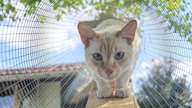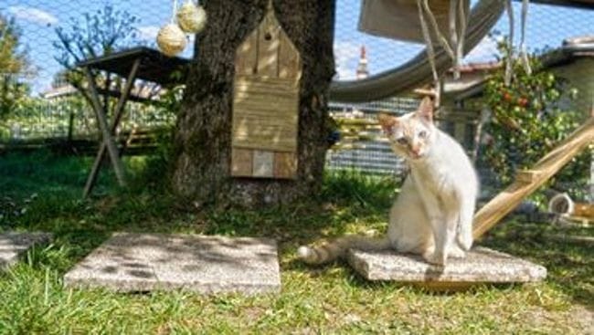 Donc nous avons une petite passerelle qui sort de la fenêtre des WC et qui file jusqu'à la chatterie en cours de construction. Cette chatterie sera collée au grillage mitoyen et de l'autre coté il y a le jacuzzi du voisin .