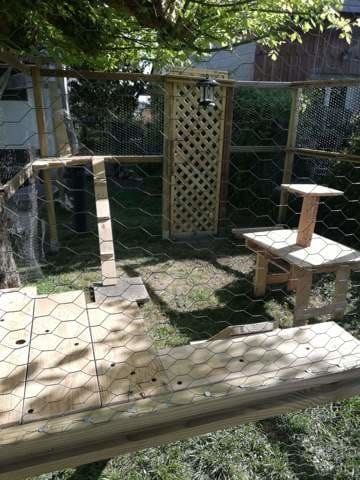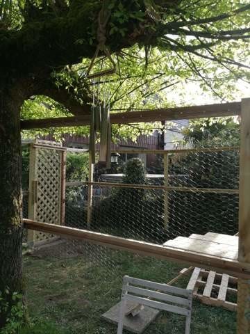 Donc nous avons une petite passerelle qui sort de la fenêtre des WC et qui file jusqu'à la chatterie en cours de construction. Cette chatterie sera collée au grillage mitoyen et de l'autre coté il y a le jacuzzi du voisin .