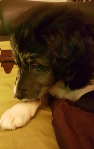 je pense qu'elle a pris beaucoup du border mais je ne connaît pas assez le braque et le labrador pour savoir lesquels de ces caractéristiques elle a pue hésiter. La seule informations que j'ai débusqué bien que pas applicable je pense car elle concerne les border (mais certainement pas croisé) est que s'il ont la truffe pas entièrement pigmenter sont poil adulte ne sera pas moucheté et sa truffe se pigmentera que fil du temps.
