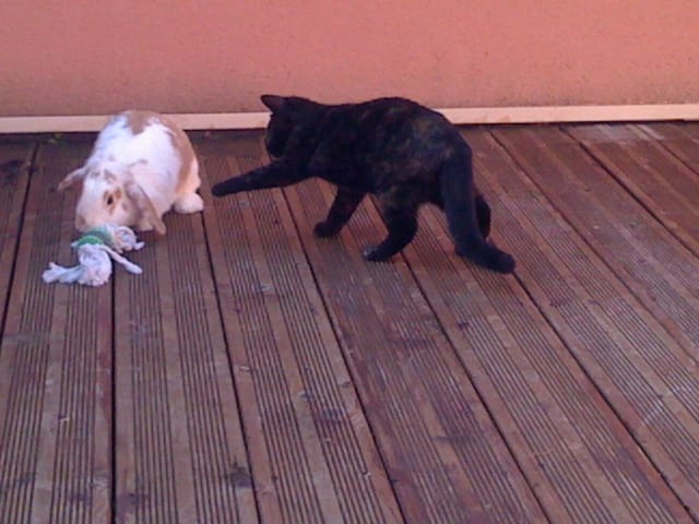 voila Komen ma lapine qui joue avec le jouet du chien et Fée Lyne qui joue avec le Lapin !