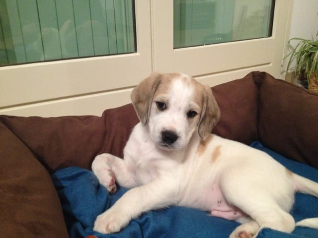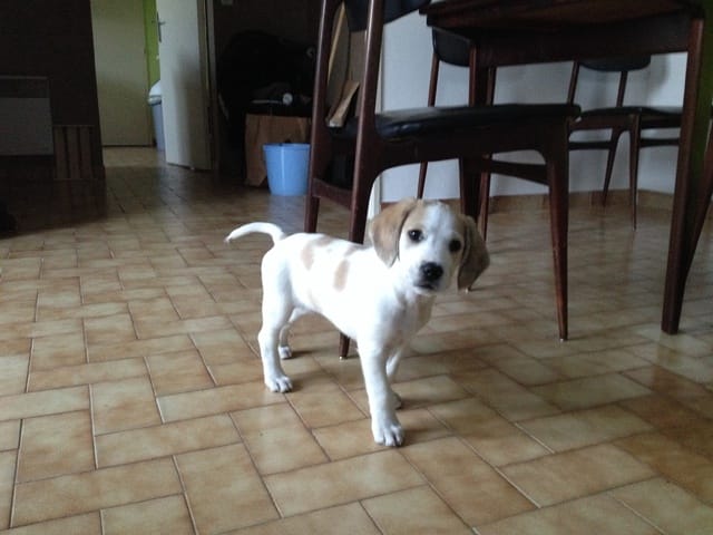 Beagle ou épagneul breton (en tout cas mon épagneul lui ressemblait beaucoup quand il était chiot )