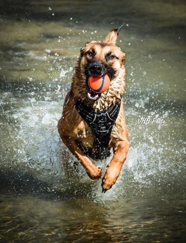 Superbe photo de Nouchka en train de courir dans l'eau avec sa balle, prise par un photographe pro dont j'ai croisé la route en promenade.