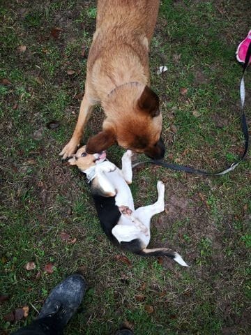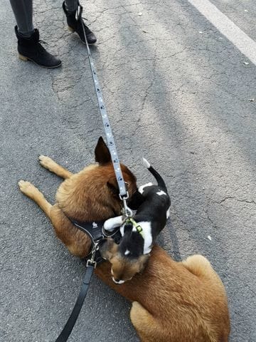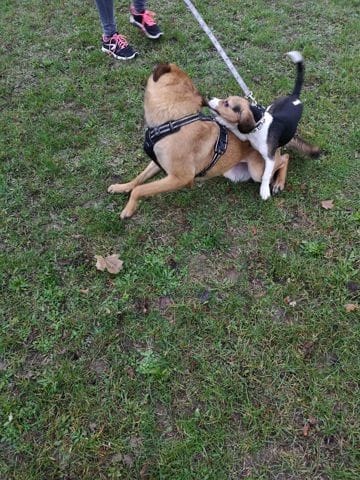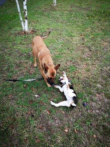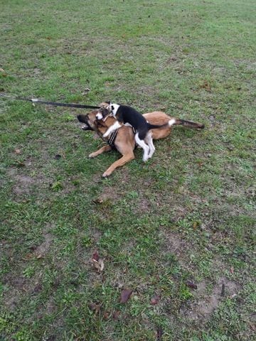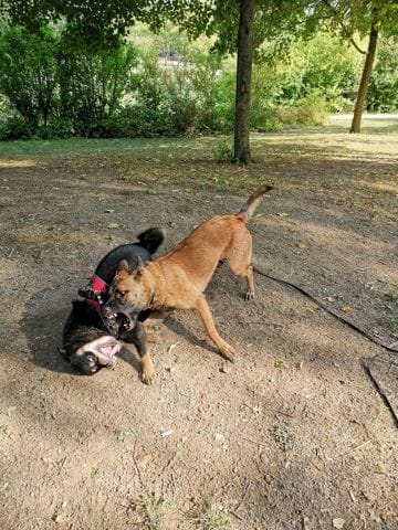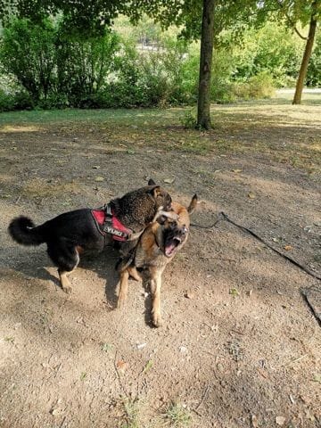 Sinon j'ai la chance d'avoir une chienne qui s'adapte à plein de façon de jouer différentes, quand elle joue avec un chiot par exemple elle est super douce, attentive fait preuve de maitrise et pareil quand c'est un chien assez fragile comme le petit teckel qu'on peut voir plus haut.