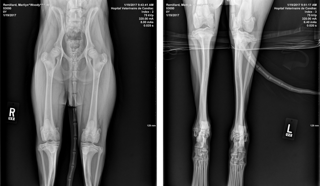 Depuis environ 1 mois, il a commencé à marcher d'une drôle de façon. Il marche en canard, on dirait qu'il tente d'utiliser le moins possible ses pattes arrières. Quand il court, il court en lapin. Nous sommes allé voir un vétérinaire. Celui-ci était persuadé qu'il s'agissait d'un problème de hanches mais en faisant passer des radiographies il a constaté que ses hanches étaient parfaites. Il a dit que le problème semble être à ses genoux mais il n'était pas en mesure de dire plus donc il nous envoi voir un spécialiste. Avant de consulter le spécialiste ($$$), je me demandais si quelqu'un avait déjà eu un problème semblable avec son chien et comment le problème avait été réglé. J'espère qu'il n'aura pas besoin d'une opération... Si ça peut vous aider, voici les radios :