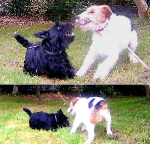 il a commencé à "charger" mon conjoint, souvent quand celui çi fait un truc dans le jardin. Il se met en position jeu (les fesses en l'air), l'évite, le cherche un peu ... et finit par vraiment le charger à toute vitesse en "s'amusant' à le froler, voire même à venir un peu le "pincer" - mon conjoint demande le calme sans aucun effet, et c'est généralement quand je débarque qu'il se calme direct. Cela lui arrive même de ne pas se calmer tout de suite et de tenter son cirque sur moi ... ce qui marche moins bien, j'exige un retour au calme immédiat et un assis, et cela rentre dans l'ordre très vite.