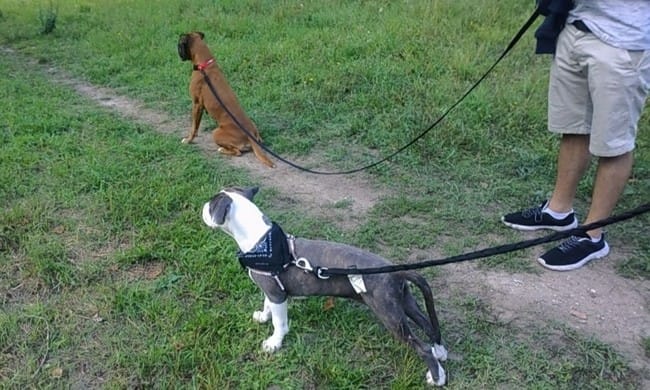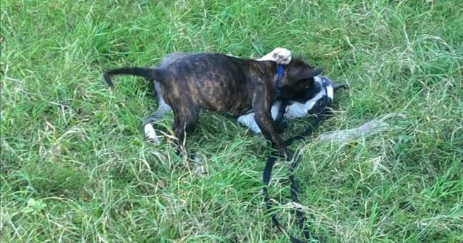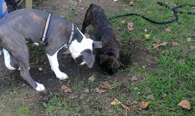 Je vous avais dit que notre p'tite mousse l'avait rencontré dès son arrivée ici, le soir même. Un amstaff à l'époque 4 mois. Ils étaient devenus de très bons amis, un mâle qq peu soumis et joueur, une femelle plutôt dominante joueuse aussi. Lui plus gros plus fort et elle, un grognement et hop c'est réglé, l'amour fou repartait en deux minutes.
