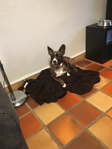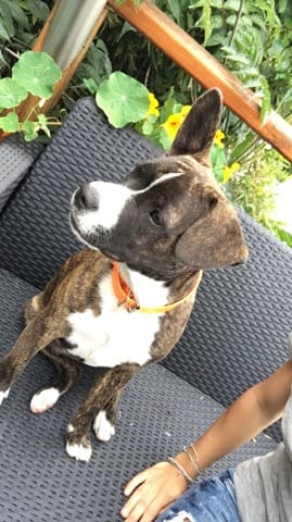 elle a un air de bouledogue en effet. Pour sa couleur y a peut être du boxer d'où sa couleur bringé, et son poitrail blanc. Cursinu pourquoi pas mais c’est pas un chien très courant, en tout cas moins que le boxer ou bouledogue donc je pencherais plus pour ces races là.
