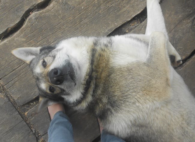 Ces un chien loup de saarloos vraiment trop adorable ,il adore l'eau (nous avons un lac devant la maison et si baigne tous les jours !) et les chats !