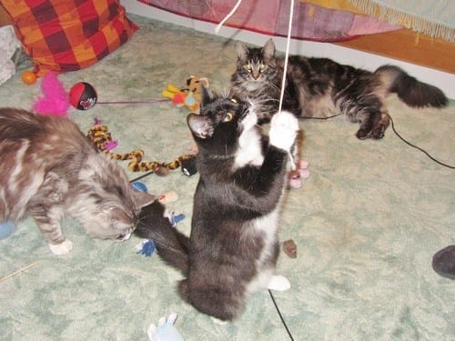 Les chats ont un tunnel, des cannes à pêches, des balles, deux arbres à chats et deux griffoirs.
