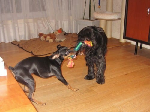 Les chiens jouent surtout avec des vieilles peluches, deux os en caoutchou très dur, un anneau.