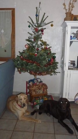 salut! je viens poster une photo de mes toutous devant le sapin de noel benji le labrador chocolat de 8 ans et inox le labrador * golden sable de 1 ans et demie :)
