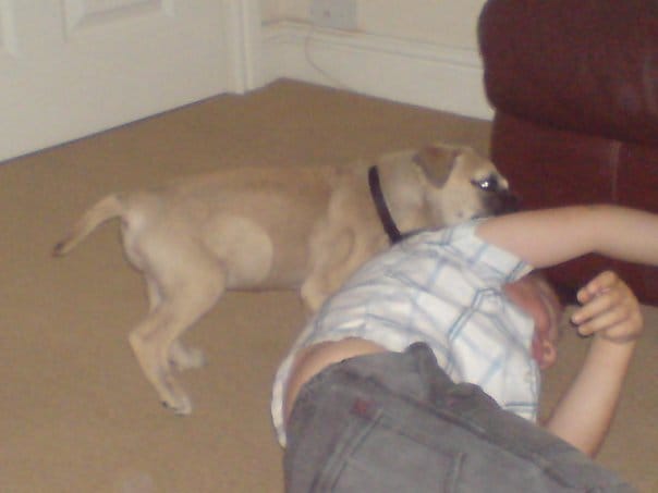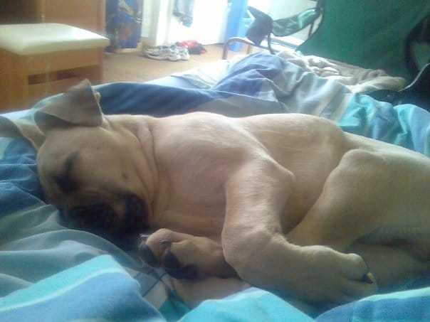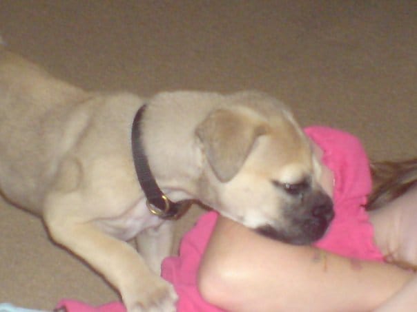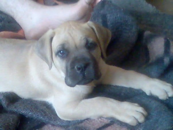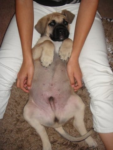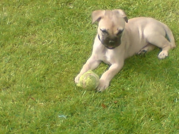 Le chiot est un mastif d'environ 3 mois, c'est un mal, trés calme, il aime les calins et ne fai pas de betises depuis hier.