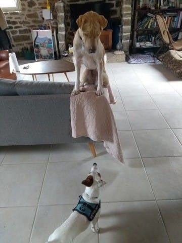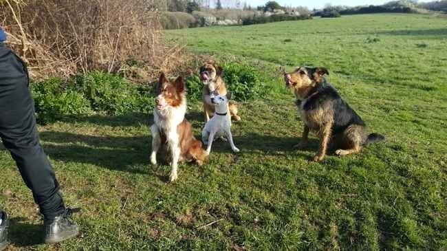 Ce chien a une histoire pas géniale : né en avril 2018, trouvé errant pas identifié début été 2018, l'asso recherche son maître, le fait identifier et comme personne se manifeste, le met à l'adoption, là le maître réapparaît, l'asso lui rend le chien mais la présidente ne fait pas le changement ICAD. Fin décembre 2018, coup de téléphone d'une SPA à l'asso "on a un chien avec une puce à votre nom" - le maitre avait atterri en hôpital psy et le chien en refuge. Et là, l'asso récupère un chien négligé,ingérable, pas OK chien, pas OK chat, agressif bref impossible de le placer en FA. Décision est prise de le mettre dans un refuge qui fait pension ou il doit être travaillé. Mi décembre, toujours signalé comme pas OK chien, il doit changer de refuge et doit être vacciné contre la toux du chenil. Une FA propose de laisser son chien chez la présidente 4 jours et de prendre ce chien seul. Une fois, le Jadgterrier arrivé chez la présidente, elle tente de le présenter à sa meute de 11 chiens et là, ça passe. Plus question de pension, il part en FA mais on est juste avant noël et sa FA a prévu des vacances dans sa famille ou il y a des chats. Donc on a fait appel à nous, puisqu'on a pas de chat. Il a passé les vacances de Noel chez nous, et quand sa FA doit s'absenter, il est convenu qu'on prenne en charge