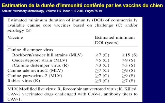 Vous voyez par exemple pour la rage dans cette étude c'est jusque 7 ans d'immunité. Alors pourquoi ne pas changer les recommandations à présent ? Je suis d'accord avec vous et on tend peu à peu à éloigner les rappels...mais sachez qu'en tant que vétérinaire, on peut se retourner contre nous si nous allons à l'encontre des recommandations labos et que votre chien tombe malade.