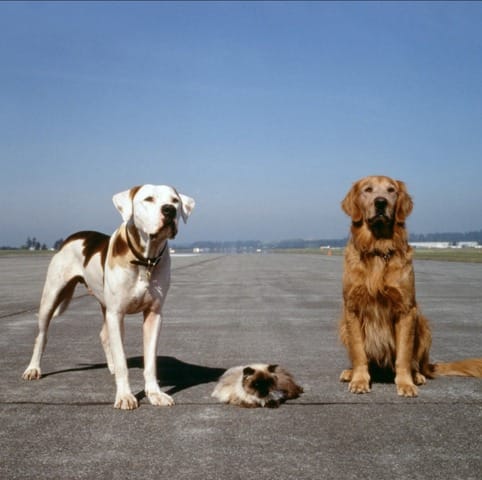 Il y avait deux chiens, je crois me rappeler un Labrador, un Bull terrier et un Chat Siamois (ancien type, à tête ronde).