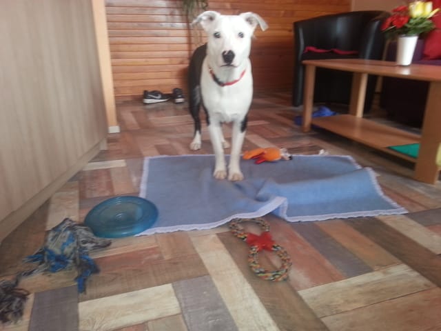 Bonsoir a tous je viens de m' inscrire au forum,en fait je viens d' d'avoir un chien âgée maintenant de 1 ans il été abandonné par son maitre dans un sac poubelle avec ses sœurs et a été sauvé par un refuge,le problème c'est que je ne connais pas sa race a pars qu'il est croisé chien berger d'après le vétérinaire avec je pense staff ou pitbull vu les yeux globuleux et une assez fine queue je ne sais pas trop et j'aimerais vraiment savoir su quelqu'un pouvais m'aider voici une photo