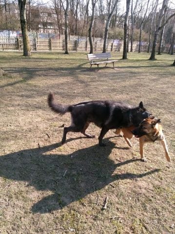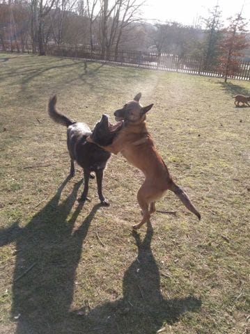 Bon j'ai pas de photo de ma louloute seule récente, la voici en compagnie de son pote Wild, un magnifique chien loup américain bleu, aussi beau que sympa. A 14 mois elle doit avoir la vingtaine