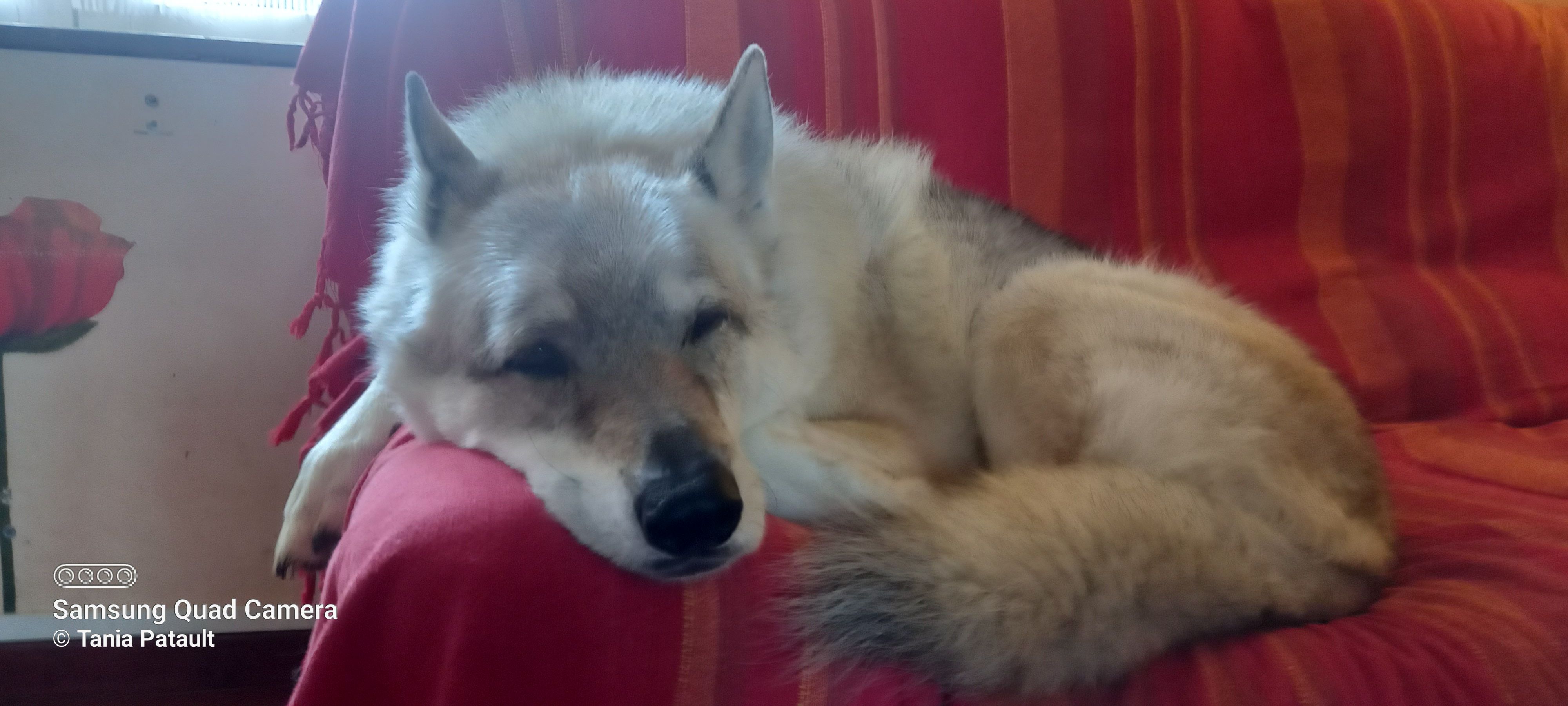 Pendant que j'écrivais ce message, Porthos est monté sur la table de la salle à manger pour laper la tasse de thé que j'y avais posée. Il en a bu très peu : je l'ai fait descendre dès que je m'en suis aperçu. Comme c'est du thé vert à la menthe, léger en théine. Je suppose que ça ne va pas lui causer de trouble notable : théoriquement, on est loin de la dose toxique. N'adoptez jamais un husky ! S'il y a une bêtise à faire, il va la faire ! Et s'il n'y a pas de bêtise à faire, il va en inventer une ! Je dis ça, mais nous l'adorons, ce vieux brigand !