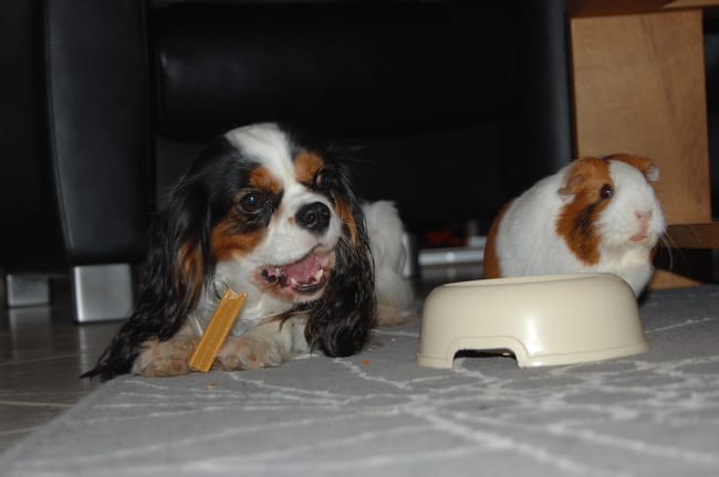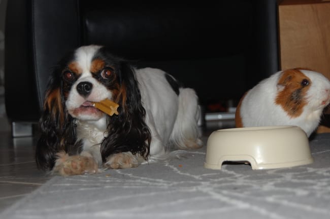 Bon, allez, je balance les photos que je viens de prendre, bien-sûr, avec yeux rouges, sans fond flou, et prises à la va-vite ... Mais la cohabitation avec mon cochon d'inde (Frimousse) et Jasmine (ma chienne) est toute récente alors, dans la précipitation, voici le résultat...