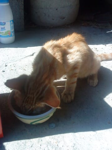 Et pour mon chat, alors une dame nous a dis qu'elle avez trouvé ce chatton dans un arbre et que son chien n'aurai pas besoins d'une seconde de plus pour l'avaler, alors nous l'avons pris provisoirement, et sommes aller faire le tour du quartier pour voir si ce chat n'était pas à quelqu'un du coin .