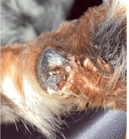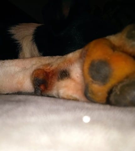 Voici le bobo pas beau. Il saigne plus, il est propre (lavage a l'eau, savon puis chlorexidrine après le séchage pour désinfecter) j'attend monsieur pour voir si on laisse a l'air libre cette nuit ou si on met un bandage. Demain matin je vais appeler le véto parce que je n'ose pas toucher pour regarder sous la plaie, peut être un corps étranger que le véto doit déloger (beaucoup de verre de bouteilles de bière cassé dans le coin).