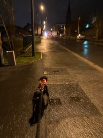 Du coup balade en laisse, histoire de le dépenser un peu plus je l'ai mit en cani marche, et on a fait un petit kilomètre de course... Le tout sous la pluie 🤭