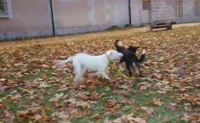 Oui heureusement qu'aucun n'a blessé l'autre. D'ailleurs le chien d'en face (un genre d'epagneul ou peut être springer ?) pouvait la chopper s'il en avait l'envie puisque sa maîtresse n'est pas arrivé de suite et moi bah voilà quoi, je ne maîtrise pas physiquement deux chiens dont un inconnu.