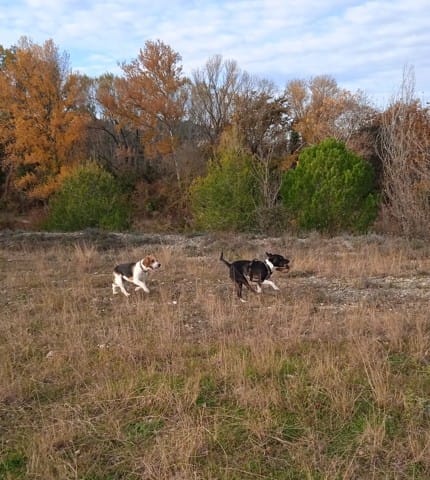 Aujourd'hui c'est un beagle débordant d'énergie super sympa qui nous a rejoint. J'ai eu un peu peur qu'il ne sache pas s'arrêter et qu'il finisse par agacer Maya. Après quelques grondement, elle s'est couché pour marquer son envie d'arrêter, le beagle s'est couché en retour. Puis c'est reparti en course poursuite. Adorable ! Il avait les oreilles complètement sans dessus dessous.