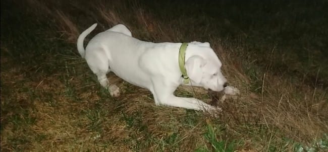 Aujourd'hui pas de jeux avec les copains, on les reverra lundi. On a donc fait une balade dans les champs et Sagro a trouvé un morceau de peau de charogne. Il était trop content ! Mais là c'était du sérieux, pas comme quand il a trouvé une patte de chevreuil. Là son bout de peau il voulait vraiment le tuer et le manger.