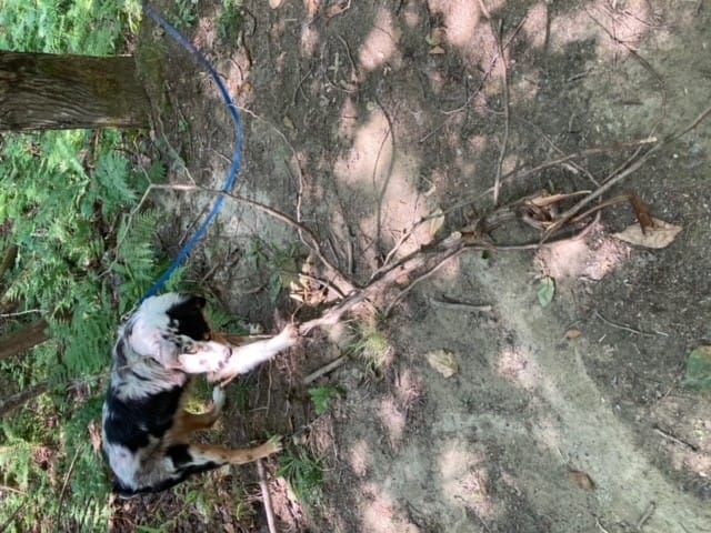 Juste il essaie de gueuler sur elle vite fait parcequ'elle avait envie de couper sa piste par un petit machouillage . Sauf qu'elle , quand elle a un truc en gueule elle veut se faire courser, du coup, j'ai simplement attendu qu'elle la fasse tomber, je l'ai tiré légèrement et demandé de pas toucher.