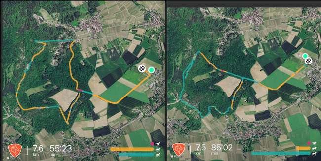 À gauche le trotting, à droite la balade (en jaune le trot, en bleu le pas) :
