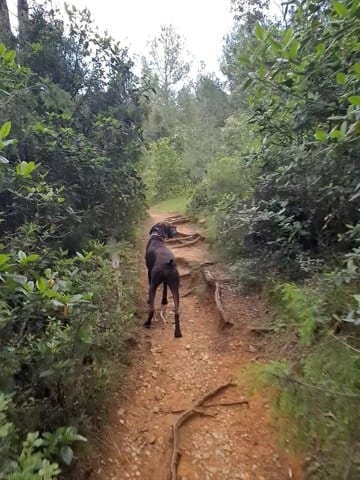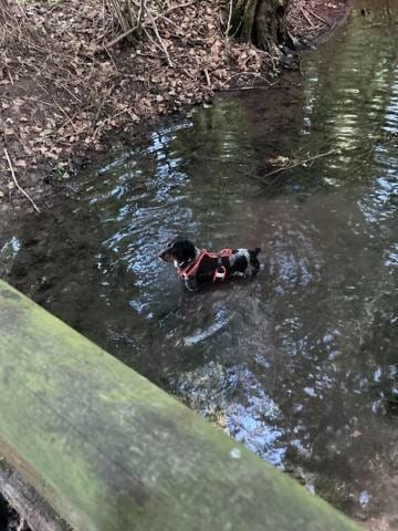 Aujourd'hui, Athos a perdu son chausson en milieu de balade, pas moyen de le retrouver... Mais bon, on commençait à refléchir à ne plus le mettre, car c'est plutôt bien refermé donc pas trop grave. Du coup, on lui a fait plaisir en changeant de route pour qu'il puisse aller se baigner, il était super heureux !