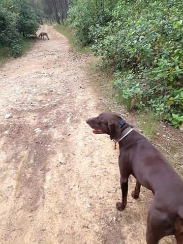 Chaque matin, avant d'enchaîner le travail c'est balades individuelles. Pour une fois Sham est sortit avant delta avec mon cheri(delta a tendance à aboyer si Sham sort sans elle). Ensuite je prends Delta sans avoir à l'esprit qu'une partie du chemin de notre balade est emprunté par Sham.