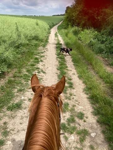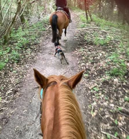 Pour Athos je verrais bien, mais je ne pense pas que ça change grand chose pour lui, il ne marche jamais de toute façon, au lieu de faire 15 000 aller et retour entre nous et plus loin, il nous rattrapera après avoir reniflé ou marqué son (immense !) territoire XD Si il a l'air de fatiguer alors je ne le prendrais plus pendant quelques temps, tant pis. Au trot, on monte à peine à 8km/h en général, ce n'est pas si vraiment rapide, mon mari viendra nous suivre en courant quelques fois.