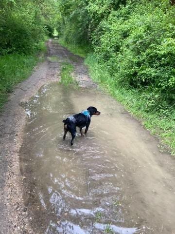 Une bonne balade de 6km, avec rencontre avec 3 chien : un berger de 6 mois et une labrador de 13 ans, puis s'est ajouté une chienne de 11 mois typé staff, Roxie, on l'avait déjà croisée et je préfère toujours partir assez rapidement avec Athos, car il essaie beaucoup de monter dessus et le maitre est très paniqué par ça. Je lui ai demandé si elle était en chaleur, en me disant que je pouvais peut être voir si elle allait recarder Athos si elle n'y était pas, il m'a assuré que non mais il était tellement inquiet que dès qu'Athos s'approchait de ses fesses il paniquait, donc on est partit ^^.