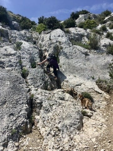 Puis dernier passage sympa, il faut grimper à travers un éboulis avec une arche pour remonter sur le plateau. Un groupe se tient en haut. On commence à grimper et arriver à hauteur des gens, je vois un chaton 😱. Harry est passé à côté sans l’avoir vu, Milo est derrière moi. Donc je choppe Milo et je demande à un monsieur de tenir Harry, il s’exécute, pas rassuré quand même. Au moment où il attrape la poignée d’Harry, celui ci percute le chat ! Mais ça va, Harry reste calme et ma copine le récupère. Sauf que je dois encore passer avec Milo. Milo hurlant, dressé sur ces pattes arrières et moi essayant de le faire avancer sur le chemin étroit, les gens et le gouffre.... je suis arrivée en haut avec un gros coup de chaud !