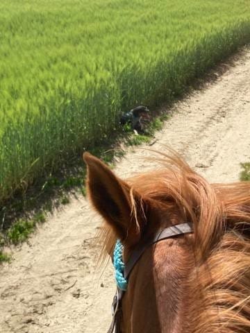 Le long de ce champs on a croisé des amis, donc on s'est arrêté discuter 5min, et Athos s'est gentiment allongé à moitié dans le champs ! 😁