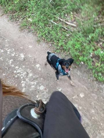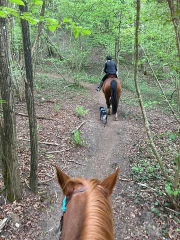 On est tombé sur deux groupes de personnes avec des chiens pas gentils : tous ont ramassé leur chien car c'était des petits chien et Athos se fiche des animaux dans les bras donc pas de soucis. Dans le dernier groupe, une personne a gardé son petit chien au sol (en laisse) qui s'est mit à aboyer sur Athos et les chevaux, là Athos c'est placé entre les chevaux et le chien, mais à distance pour ne pas être touché par l'autre et a attendu qu'on passe pour repartir et nous repasser devant 😯 Mais genre, calmement, il était pas du tout agressif envers l'autre chien, il s'est juste mit là, comme en barrière, j'étais trop étonnée !