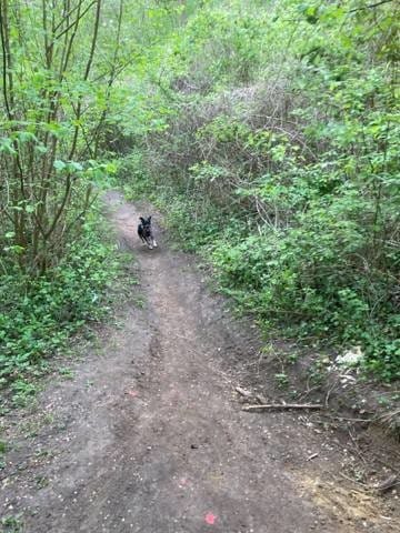 Du coup oui, Athos reste pas mal sur le chemin, il nous surveille bien aussi. Parfois il va un peu fouiner, mais comme en foret il n'y a pas beaucoup de visibilité et qu'il essai quand même de pouvoir nous surveiller, et qu'on ne s'arrête jamais de bouger, bah il préfère prendre de l'avance, renifler jusqu'à ce qu'on arrive, et ainsi de suite.