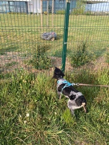 Et en rentrant on est tombé sur un truc... Traumatisant apparement XD Une tondeuse qui tond toute seule ! Athos n'était vraiment pas content surtout qu'elle nous suivait le long du grillage 🤭