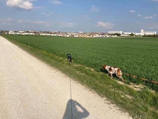 Presque milieu de balade, toujours rien, je commence à désespérer. Et puis on croise un copain, un nouveau, Rusty, épagneul breton de 10 mois ! Attaché lui aussi, apparemment il n'a aucun rappel.