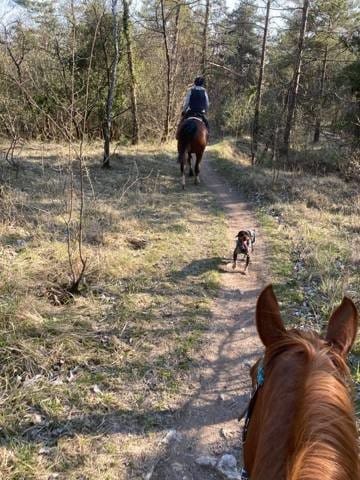 Pour la route suivante du coup, je suis descendue et je l'ai pris en laisse avec ma jument en longe à coté, tant pis on fera comme ça jusqu'à ce qu'il obéisse mieux au niveau des routes.