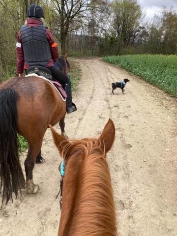 Pendant la balade, on a aussi croisé d'autres personnes de l'écurie à cheval, et du coup on est rentré ensemble. Le bon coté : Athos ne court pas sur les autres chevaux, il n'aboie pas non plus... par contre il ne se méfie pas du tout non plus et leur passe devant et derrière sans s'inquiéter plus que ça. Heureusement les chevaux de notre écurie sont habitués à sortir avec les border de la propriétaire, mais j'ai un peu peur de ce qui se passera si on rencontre un cheval inconnu.
