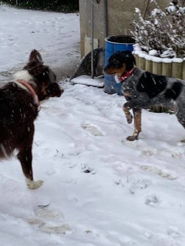 Chez moi je n'ai pas de photos, mais la neige est également descendue jusqu'à ma porte ! Ce soir on révise nos compétences de chien de traineau a la maison 😁